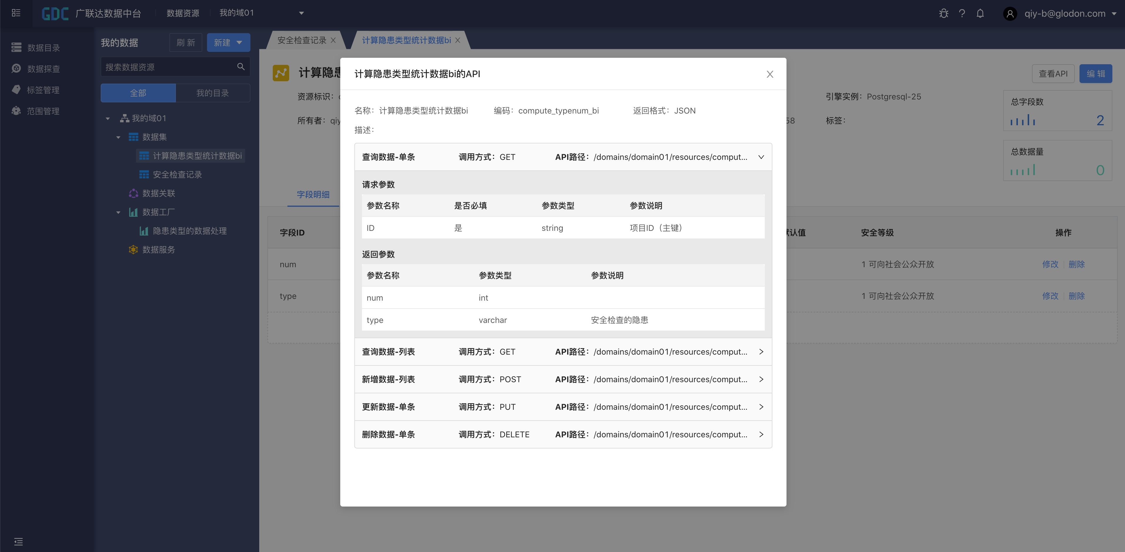 同时数据资源的API服务已经自动创建,点击“查看API”就可以获取相应的调用方式。