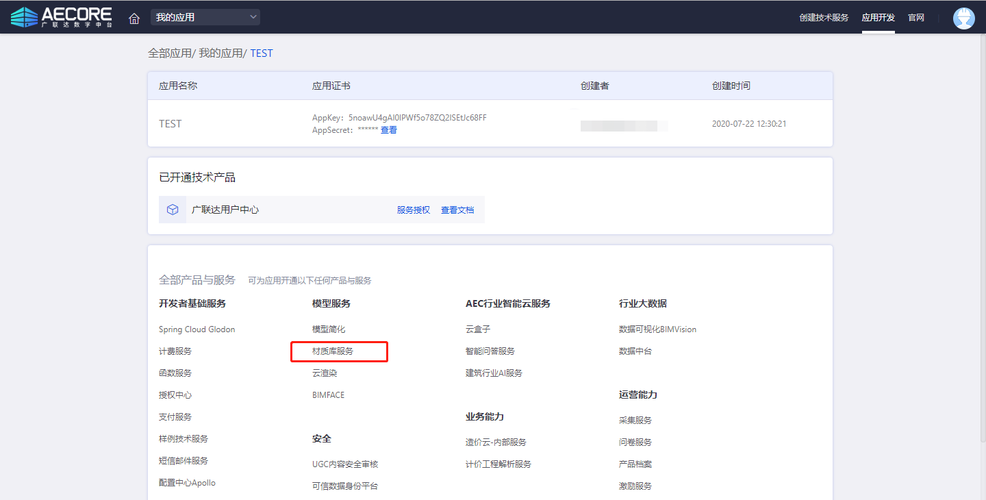 登录AECORE,并创建应用,创建应用后即可获取appkey、appsecret,这是调用服务的秘钥请妥善管理。
