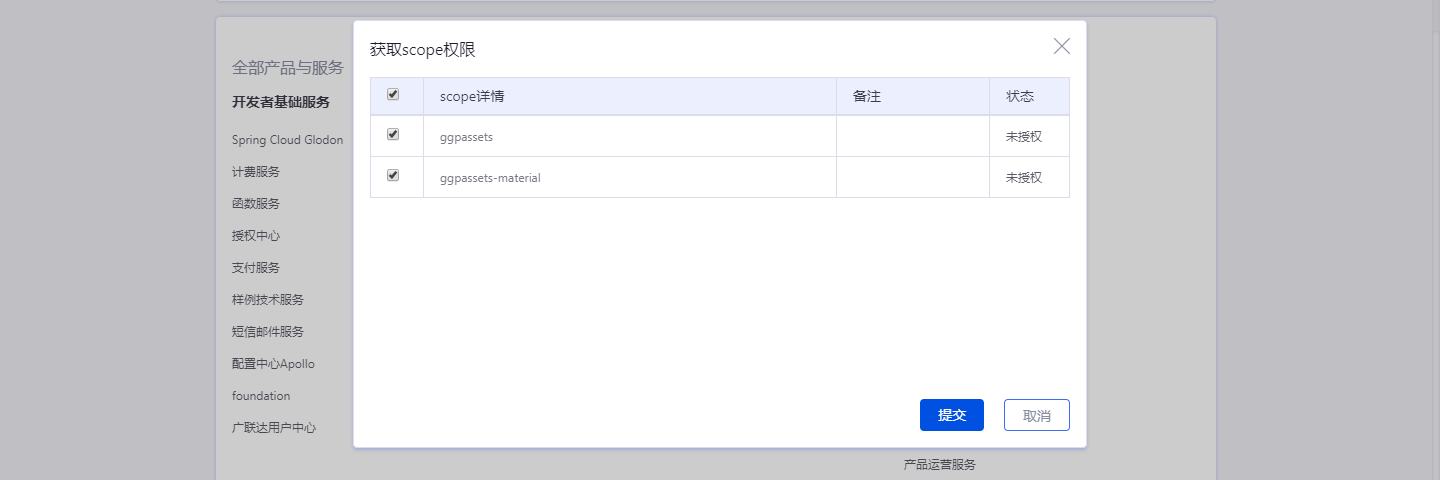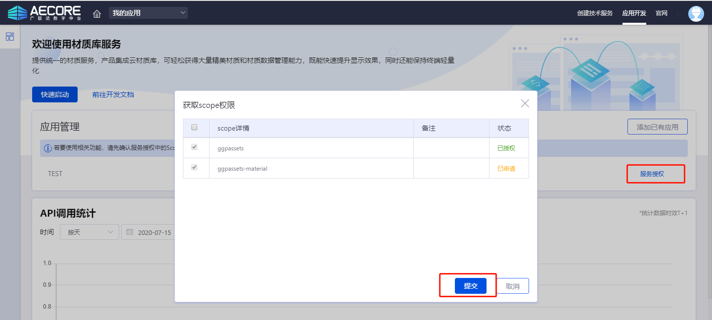 应用创建后选择并开通材质库服务,申请应用scope