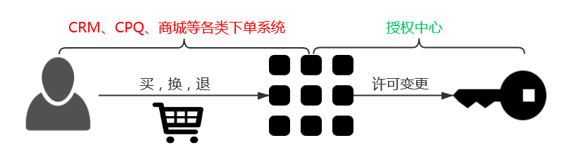 如上图所见,企业产品是通过各类下单系统销售出去的。软件和在线服务由于其产品的特殊性,客户购买的实际上是产品的使用许可。此外,买、换、退是交易过程中常见的三种行为,支撑三种行为的前提是要对产品使用许可及时变更以维护产品提供方的劳动价值并保证购买用户的正常使用权益。授权中心提供的基础功能解决了交易过程中对许可管控的处理,使得产品提供方在交易过程中只需要聚焦于交易行为本身,大大降低了产品提供方为保障自身劳动价值所面临的交易问题的复杂性。