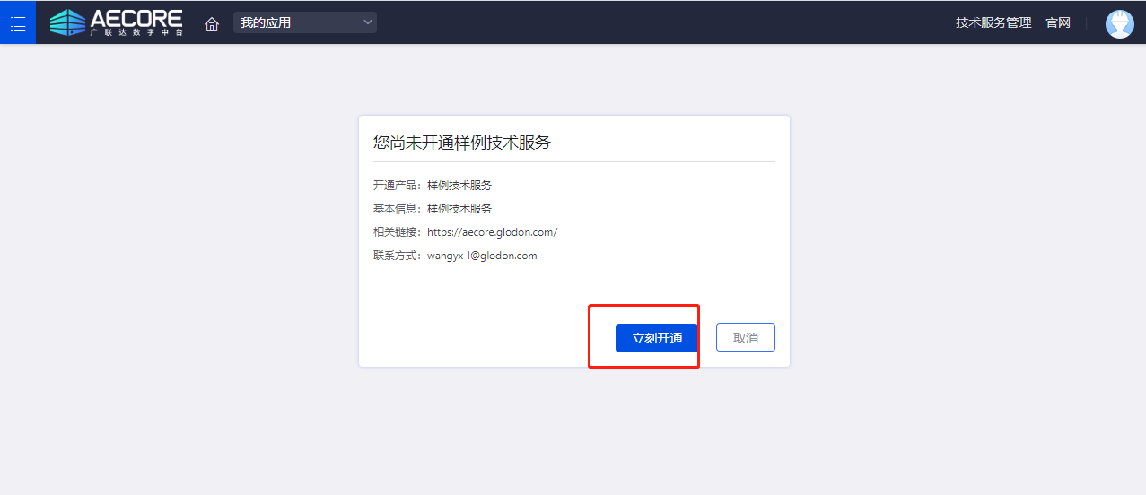 应用创建成功后即刻进入到应用详情页,在应用详情页,你可以查看应用证书(即appkey和appsecret),可选择AECORE平台上上架发布服务,进行服务开通订阅。