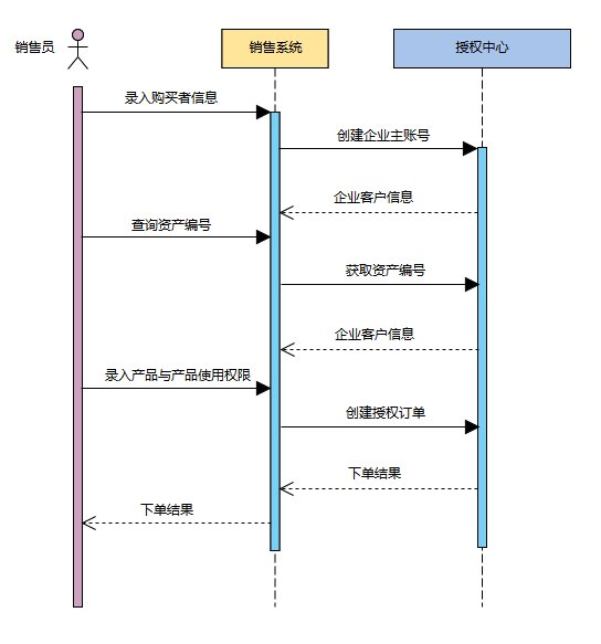 1、将销售产品时涉及的客户、授权载体类型、产品以及产品使用权限信息按照授权中心约定的数据格式传递给授权中心。