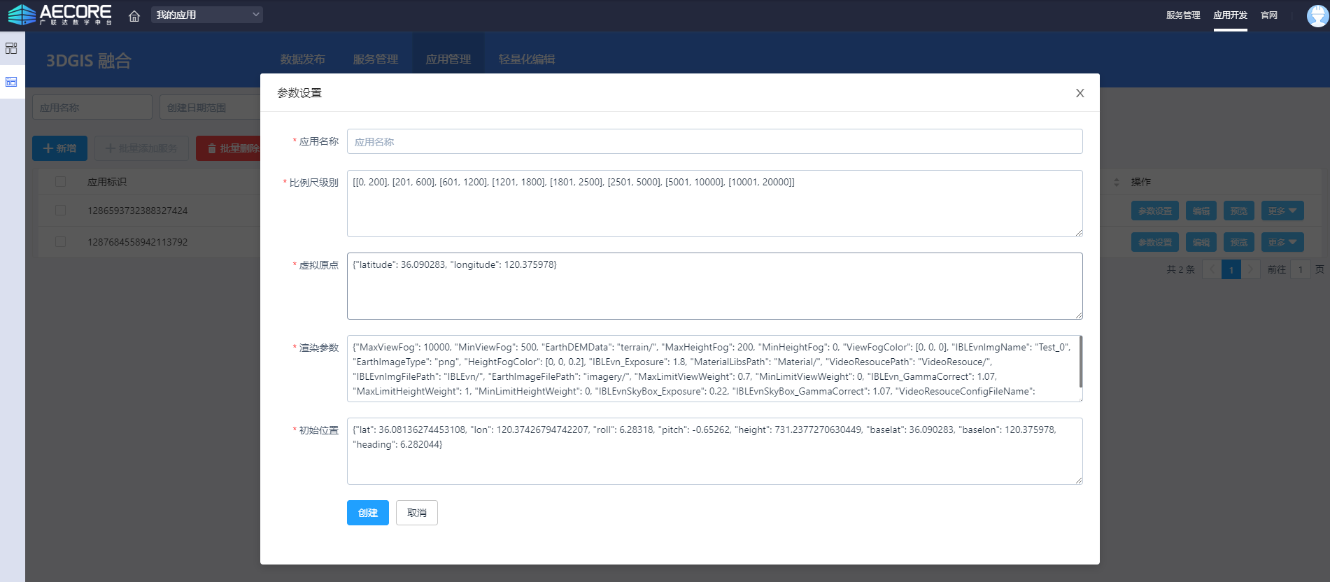 点击【新增】按钮,弹出【新增应用】的面板,输入应用的名称及默认的初始参数,如下图,点击【创建】,新的应用建立成功,在应用列表中能够实时看到。