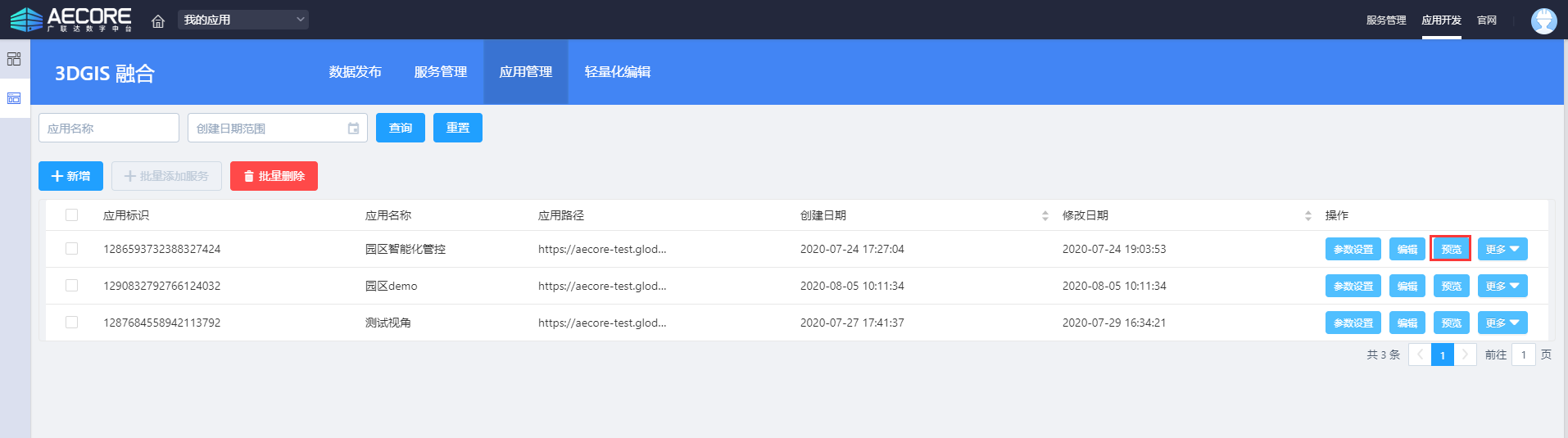 选择已存在的应用,点击列表后面的【编辑】按钮,切换到该应用的编辑页面,可以对应用的图层树、视角、通用工具进行配置,如下图: