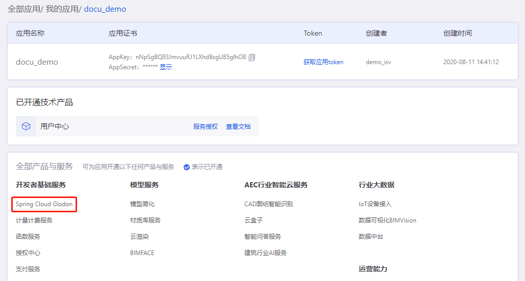 登录AECORE,并创建应用,创建应用后即可获取appkey、appsecret,这是调用服务的秘钥请妥善管理。