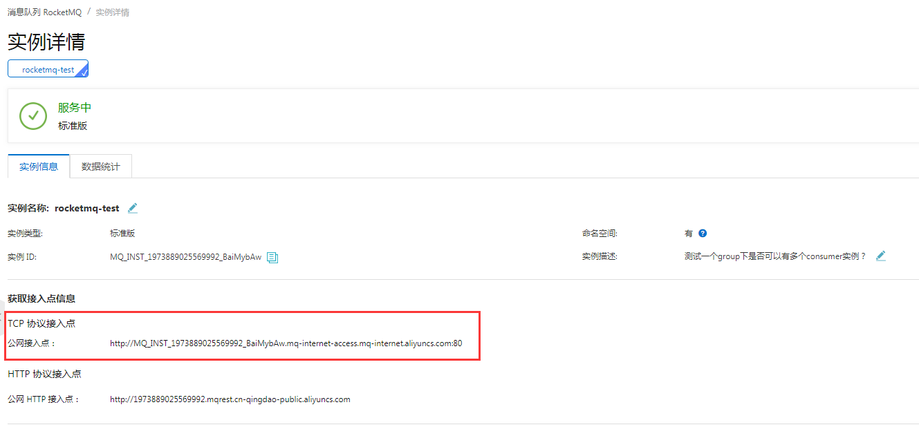 4. namesrv-addr获取方式:进入阿里云控制台,RocketMQ/实例详情,如下图所示: